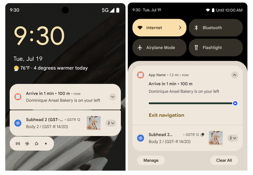- Предложен дополнительный тип уведомлений - мгновенные обновления (Live Update), позволяющий отслеживать изменение состояния, связанного с определённой активностью (например, отображение стадии доставки или движения по маршруту). Для новых обновлений предложен стиль ProgressStyle, позволяющий сформировать блок для отображений прогресса выполнения операции.