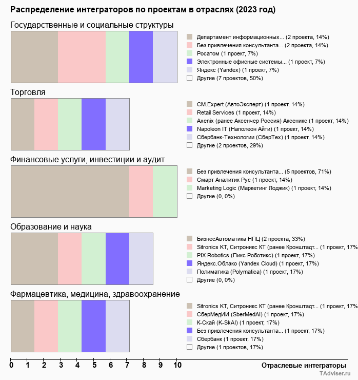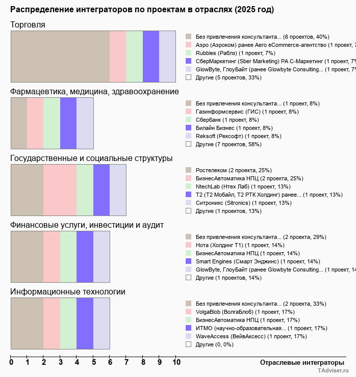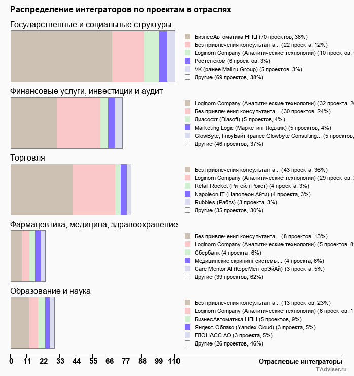 Отраслевое распределение по количеству проектов внедрений